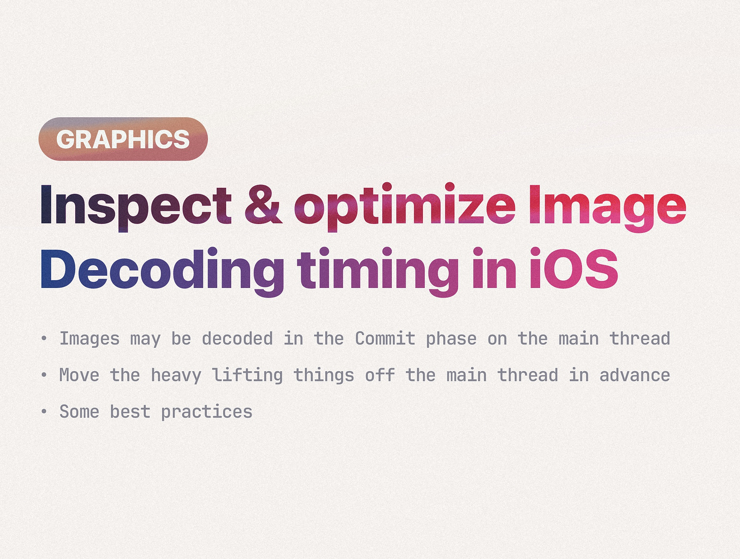 . This will decode the image right away. However, for some unknown reason, by using this approach, the system will try to do some image conversion using vImage in the commit phase, which will still slow down the main thread.