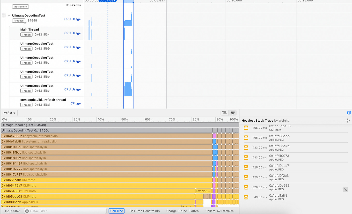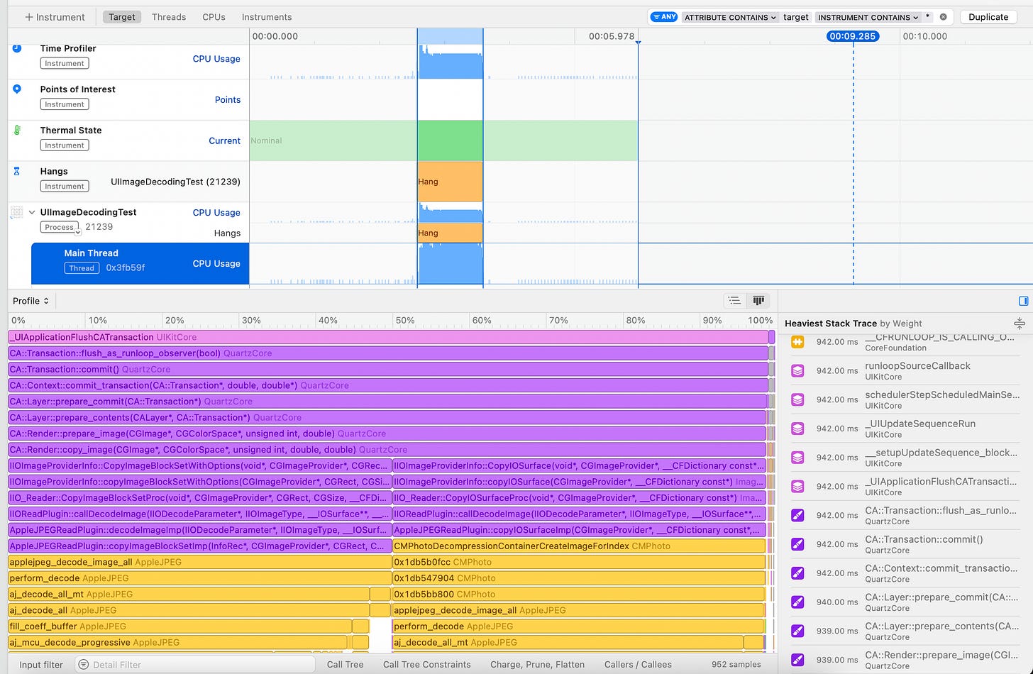 Consider the same code above, which loads a large image from a file (7952 × 5304), and then we use the Time Profile Instrument to examine the hang: