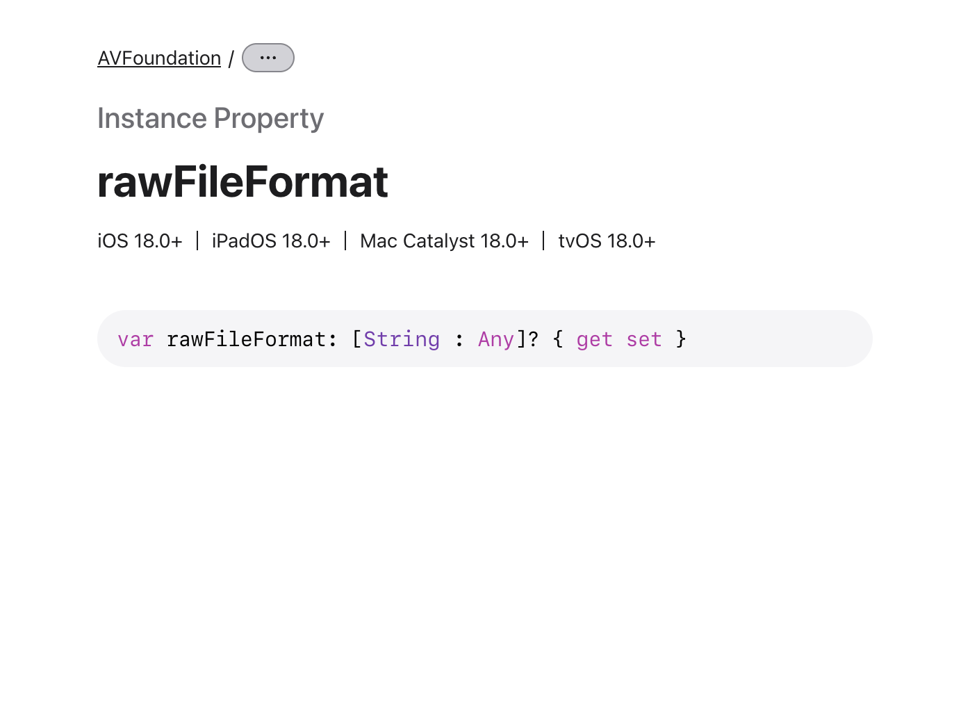 @property(nonatomic, copy, nullable) NSDictionary<NSString *, id> *rawFileFormat API_AVAILABLE(ios(18.0), macCatalyst(18.0), tvos(18.0)) API_UNAVAILABLE(macos, visionos) API_UNAVAILABLE(watchos);Well, some parts of them don’t make much sense: