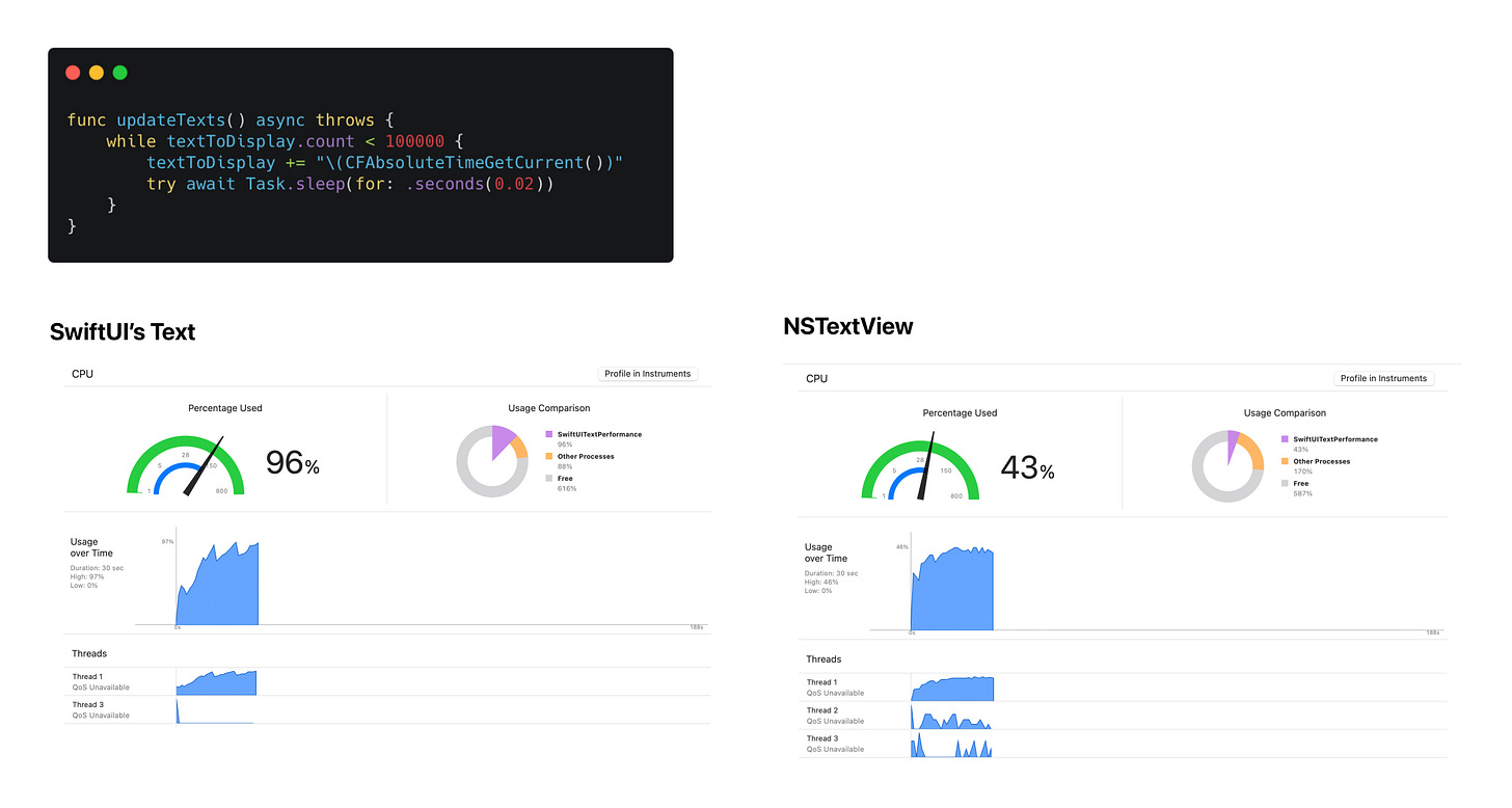 When displaying a large amount of text in SwiftUI using the Text component, the CPU usage may increase to as high as possible. The workaround I provided was to bridge the UITextView