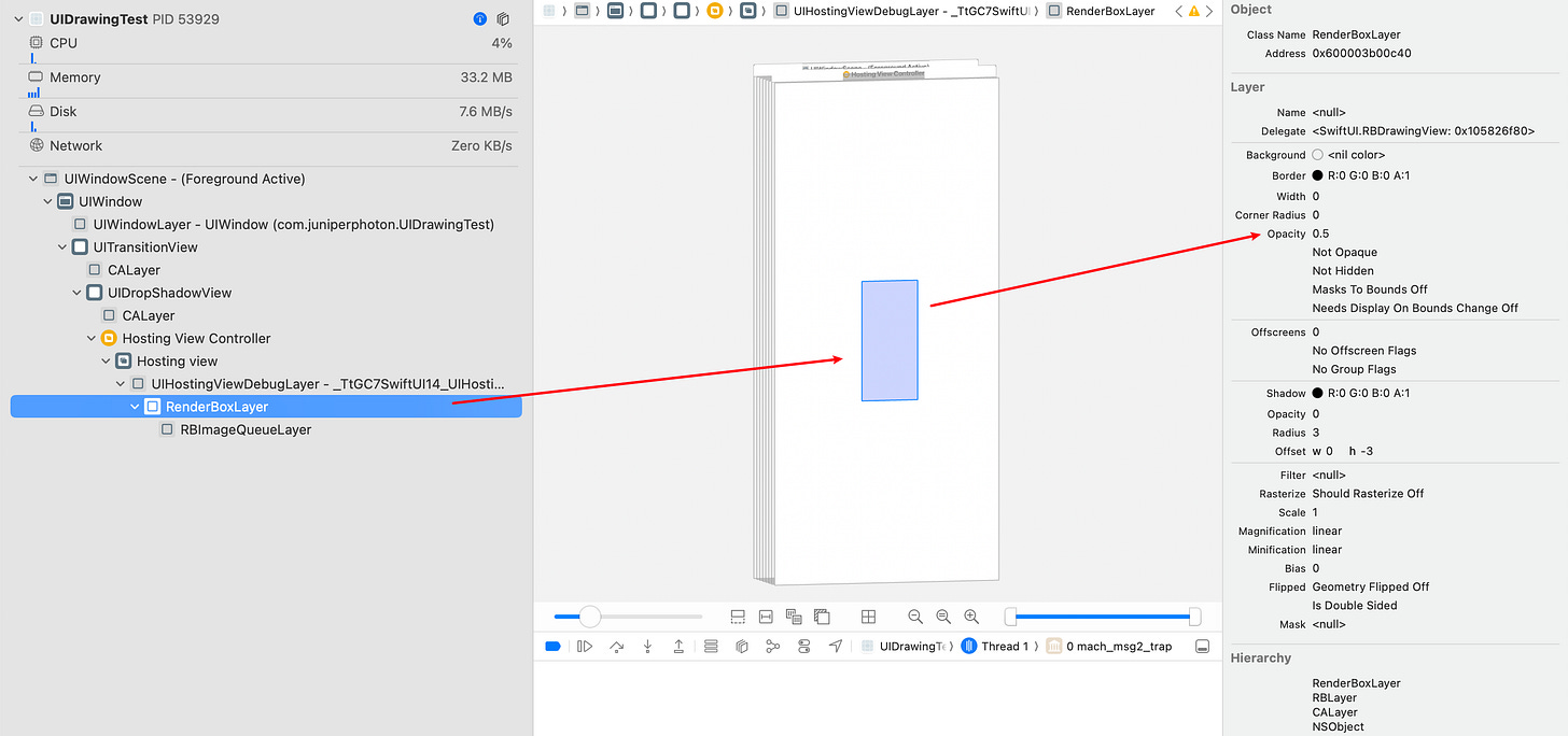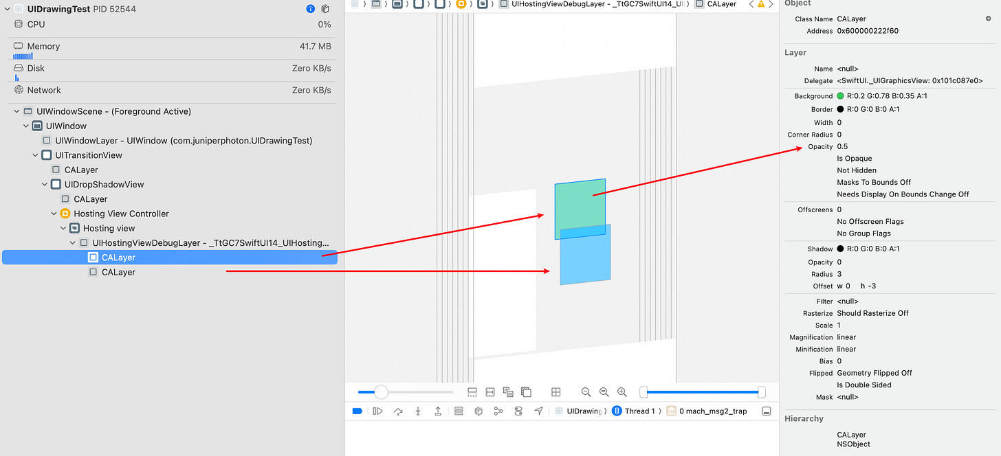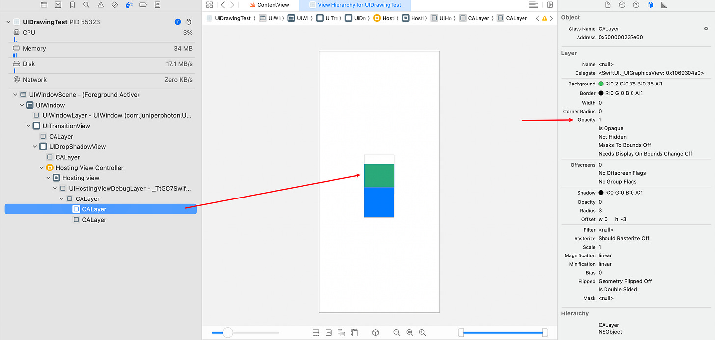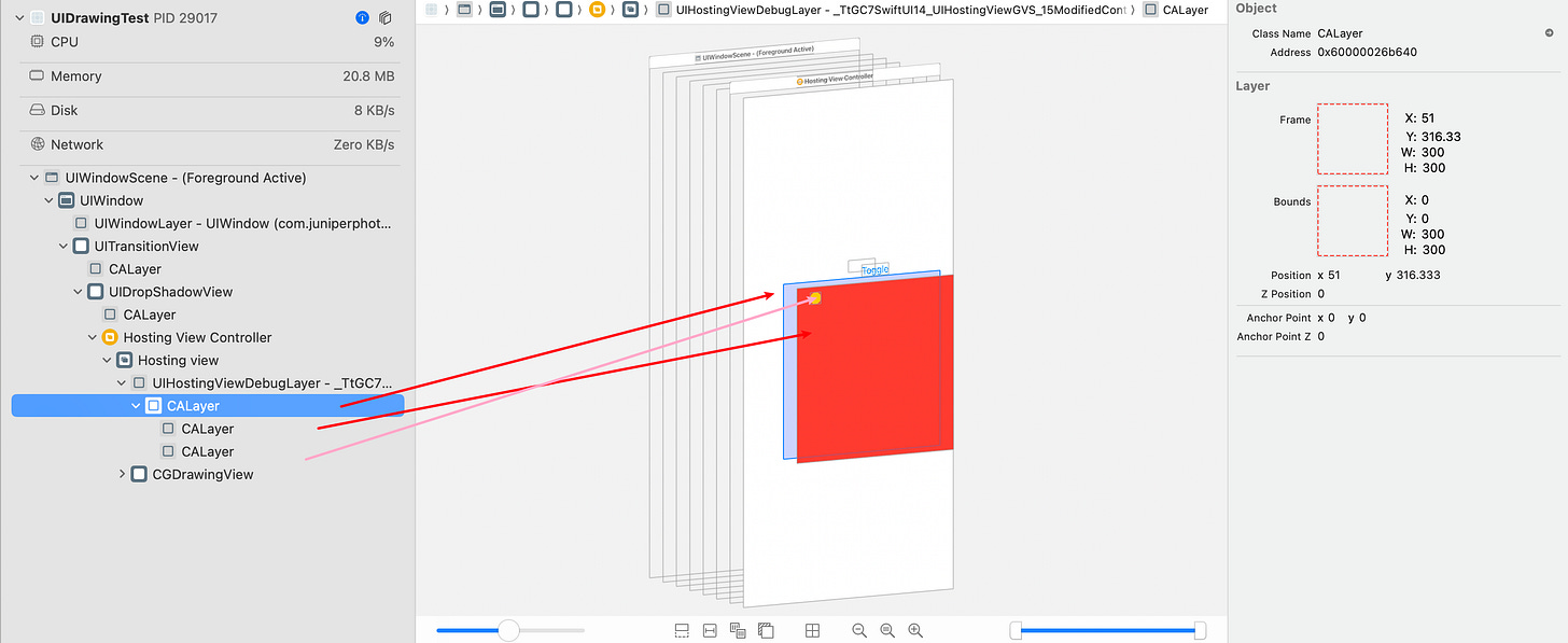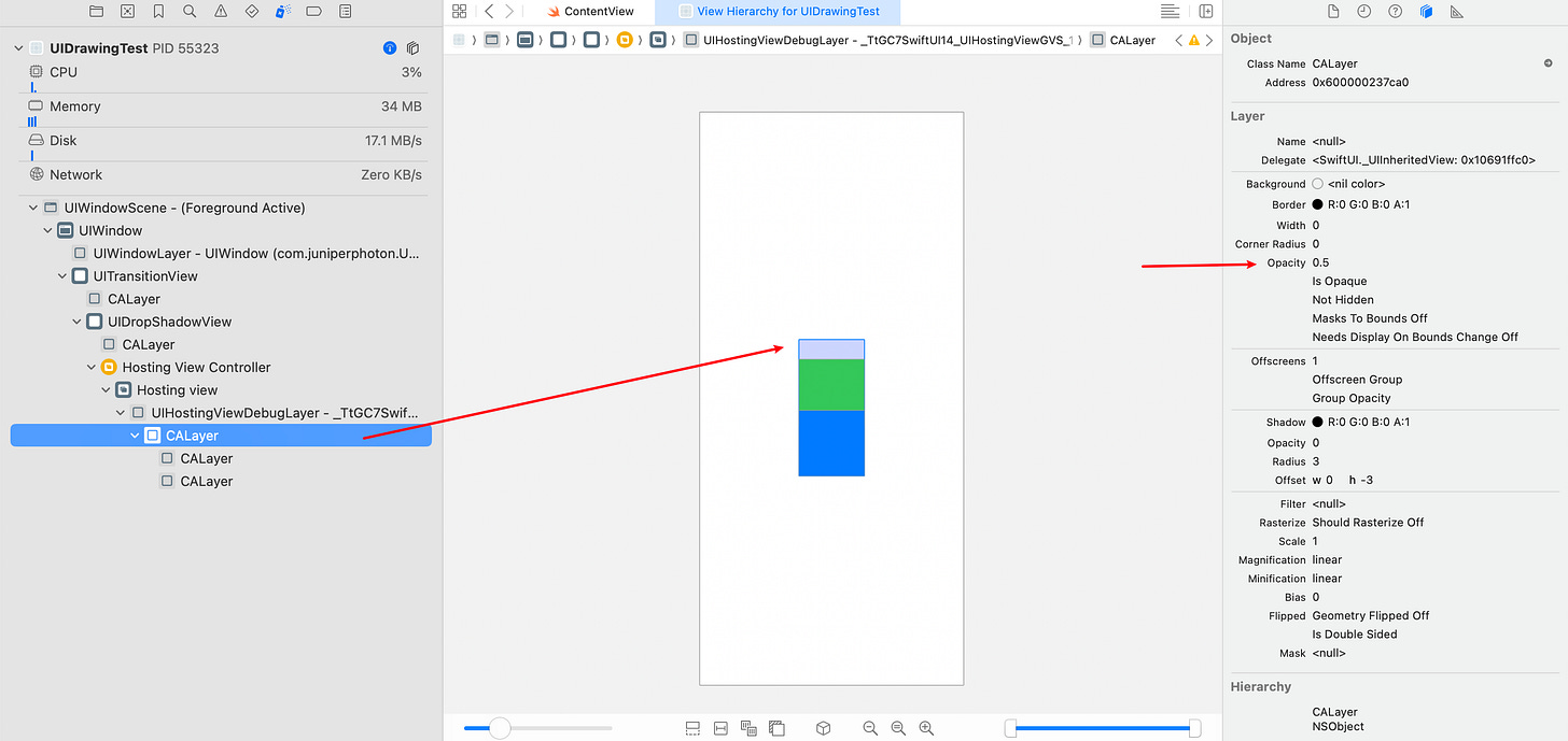 For some unknown reasons, Xcode won’t render the layer correctly in the captured image when using drawingGroup. But it doesn’t affect how we inspect the layer.