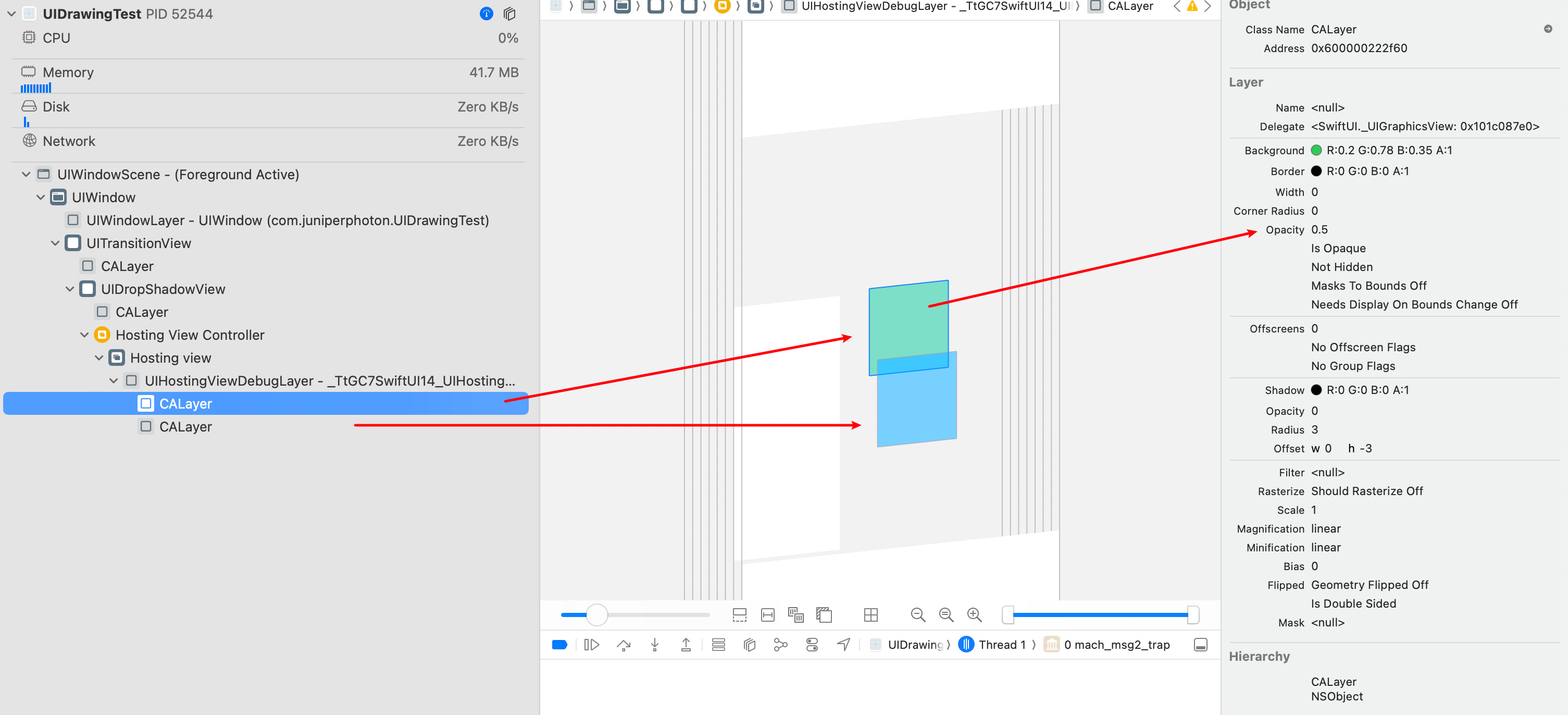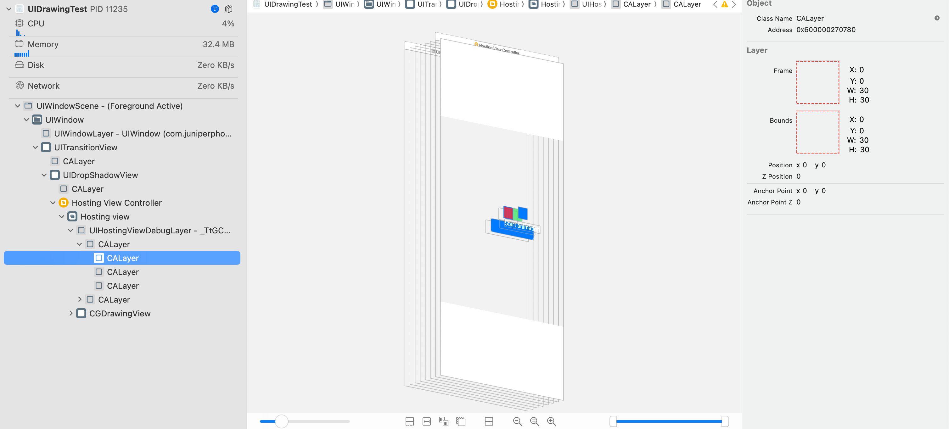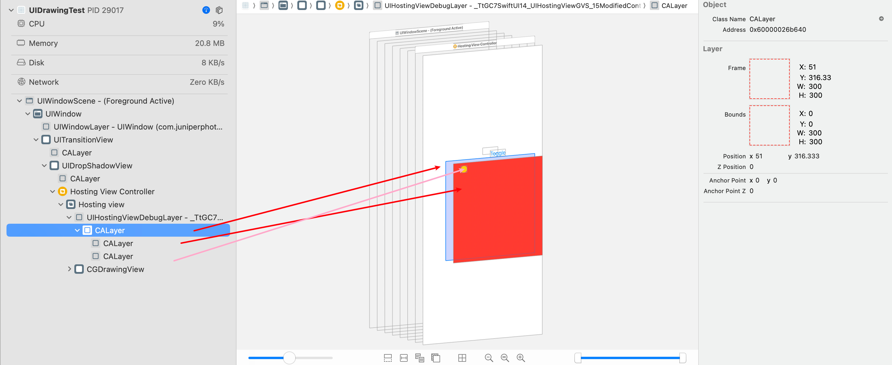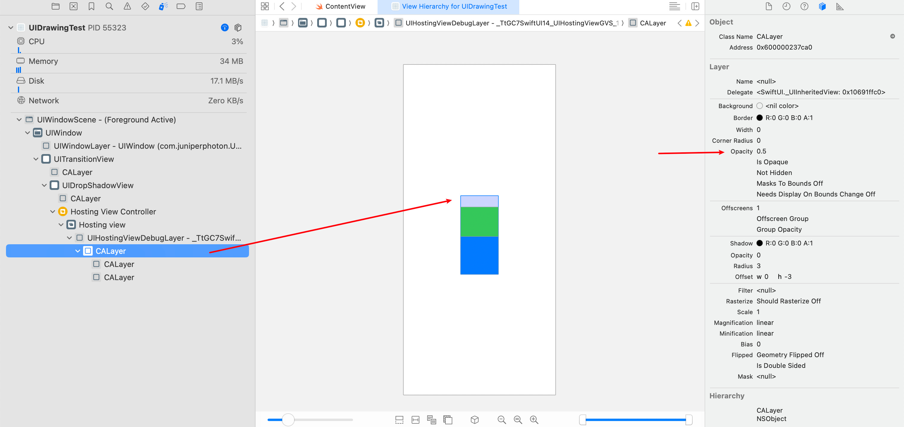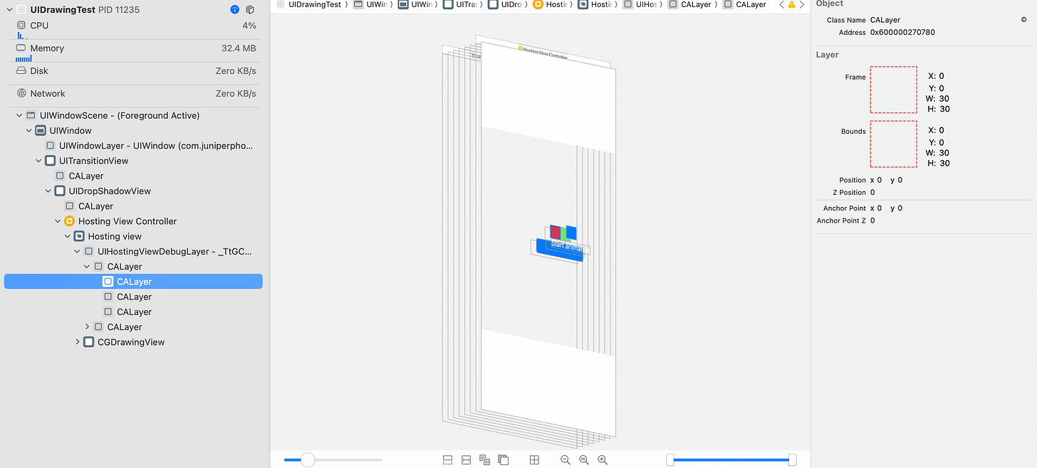 For some unknown reasons, Xcode won’t render the layer correctly in the captured image when using drawingGroup. But it doesn’t affect how we inspect the layer.