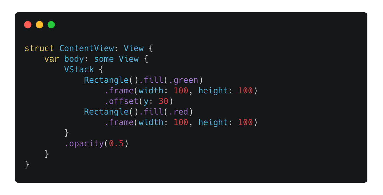 Because we offset the vertical position green rectangle by 30pt, and those two rectangles have translucent, the overlapped part appears to be cyan-ish.