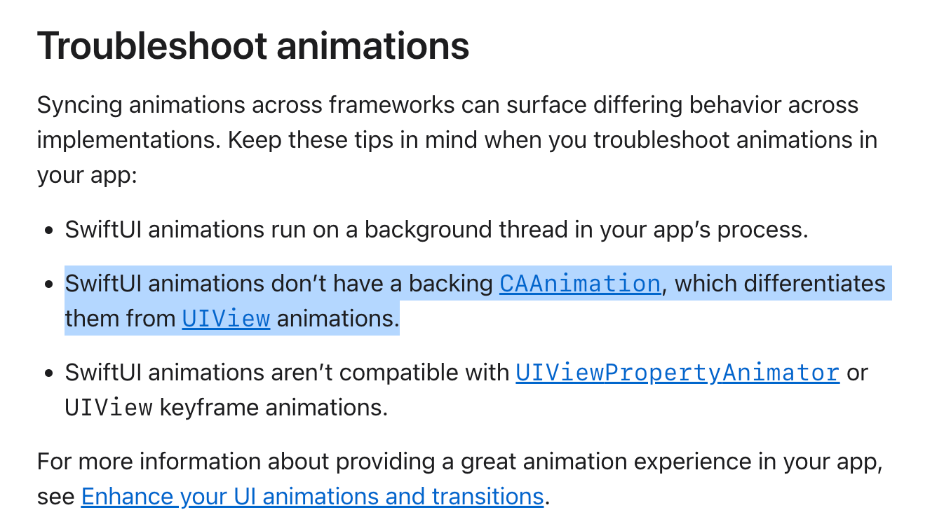 by checking its animation keys in runtime. But the fact is that SwiftUI animation isn’t backed by CAAnimation