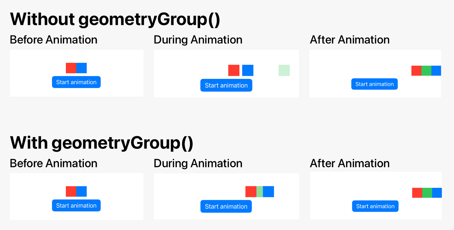 In my experience, you may need to use this in this scenario: for the view container A, if its geometry like size and position can animate to change, while its own descendants can also animate to change, you should apply the geometryGroup()