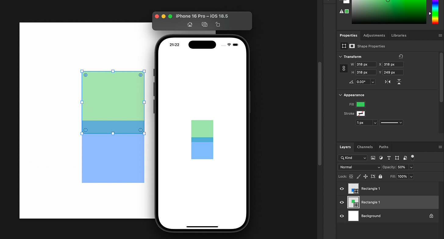 So what happens in the view hierarchy? First, the green rectangle is backed by a CALayer, and its opacity is 1.